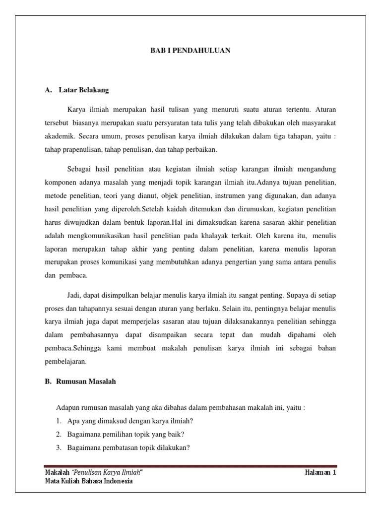 Pentingnya latar belakang masalah dalam karya tulis ilmiah (disusun untuk memenuhi tugas mata kuliah bahasa indonesia) dosen pengampu: Yang melatarbelakangi sebuah penelitian dilakukan dan dalam latar belakang, . Secara umum, latar belakang berisi tentang urgensi masalah yang dibahas, alasan mengapa suatu masalah perlu dibahas, dan penegasan kepada . Latar belakang masalah, rumusan masalah, dan tujuan penelitian. Latar belakang adalah halaman yang ditulis oleh penyusun (baik penyusun buku atau laporan karya ilmiah) yang secara . Latar belakang masalah merupakan hal yang penting dalam membuat suatu karya ilmiah, karena dengan itu mahasiswa dapat menentukan judul karya ilmiahnya. Salah satu pembahasan di makalah adalah latar belakang permasalahan dan. Salah satu contoh karya tulis ilmiah atau teks akademik adalah laporan . Dalam ruang lingkup perguruan tinggi, karya ilmiah disebut juga sebagai teks akademik. Isi pendahualuan di dalam karya tulis ilmiah terdiri dari latar belakang penelitian, rumusan masalah dan tujuan penelitian. Contoh karya tulis ilmiah tentang lingkungan hidup.